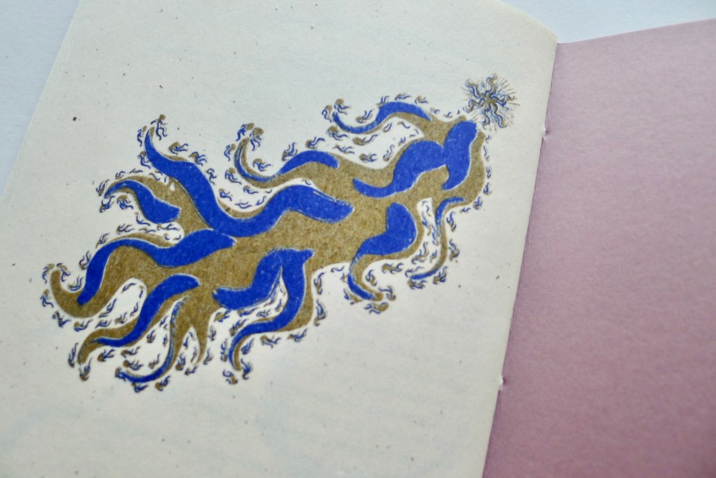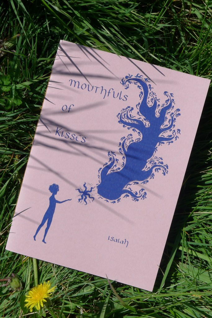 After Germination, I was ready to work on Teiresian’s next big project. mouthfuls of kisses is a debut poetry collection we released in April 2025. Myself and a volunteer edited Isaiah’s work. Then I designed and formatted the book and created a series of illustrations to accompany the poems. Once Bracken Books had printed the pages for me, I took them home and bound each of the 100 copies by hand.