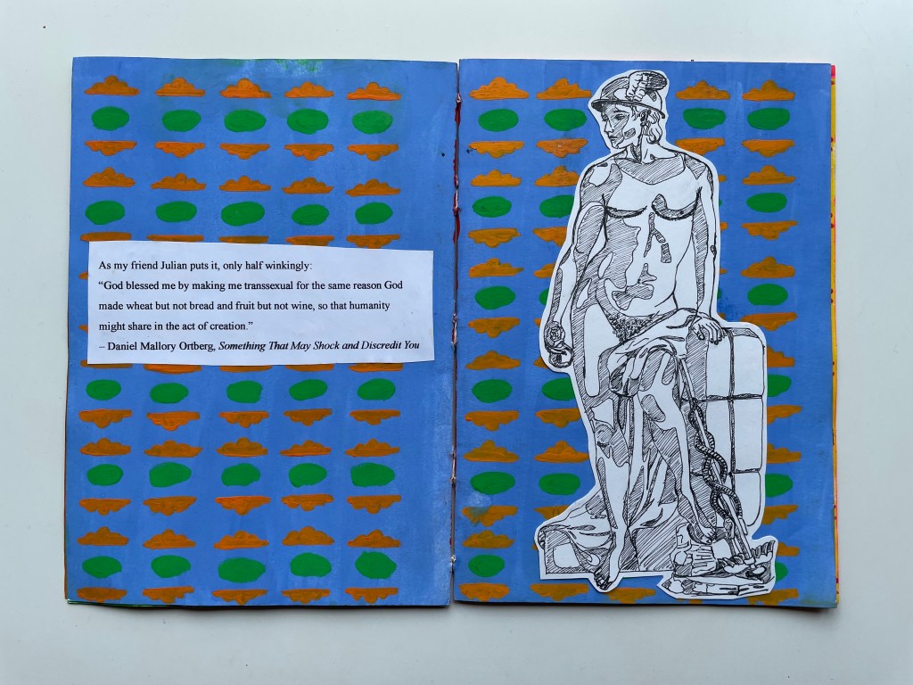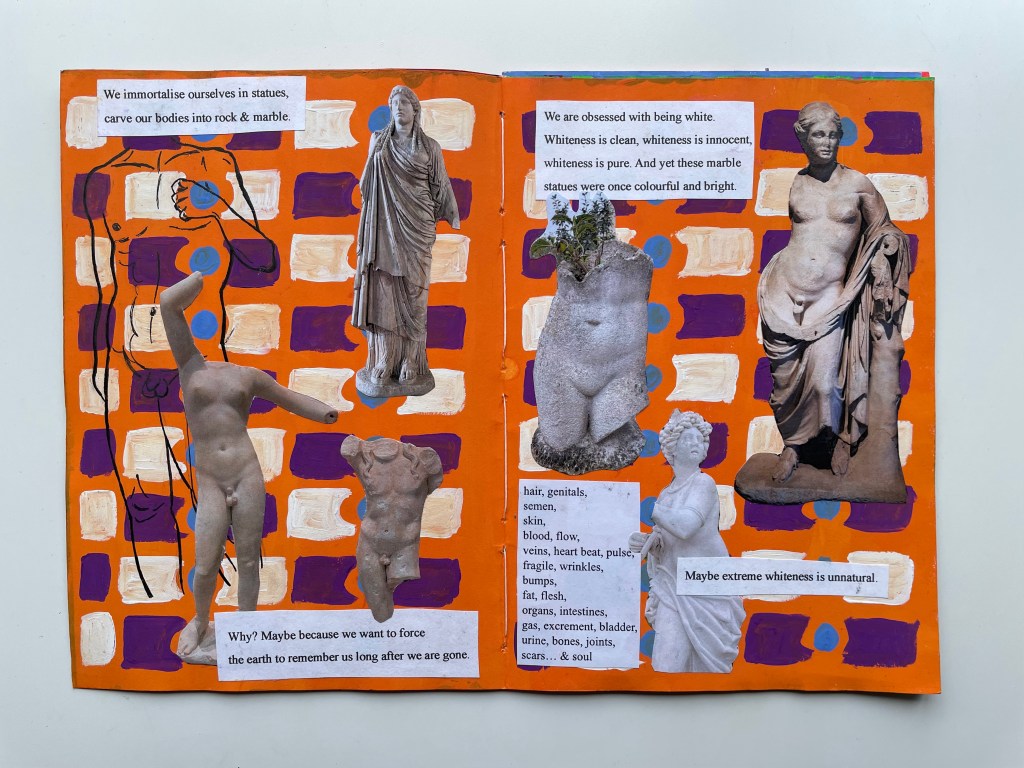 During Unit 1 of my Art Foundation Diploma, in October 2023, we were tasked with making a zine by hand. I was interested in exploring thoughts around the human body, especially as someone who is transgender and therefore has a unique relationship with my own body. I painted patterns in acrylic as backgrounds to pages, created collages with printed images, and illustrated with black pen.